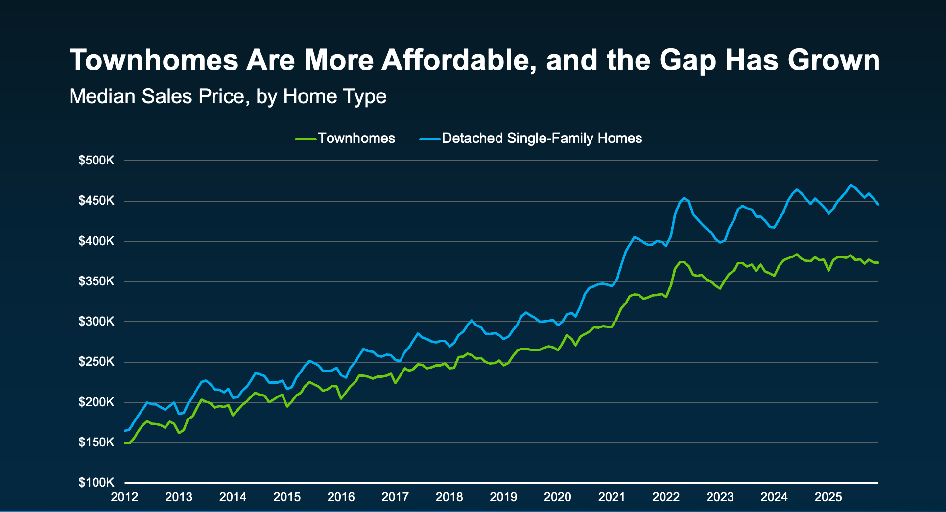 While prices vary by market, Redfin data shows townhomes are typically priced lower than detached single-family homes nationally. And that gap has grown in recent years as the supply of this type of home has grown too (see graph below):